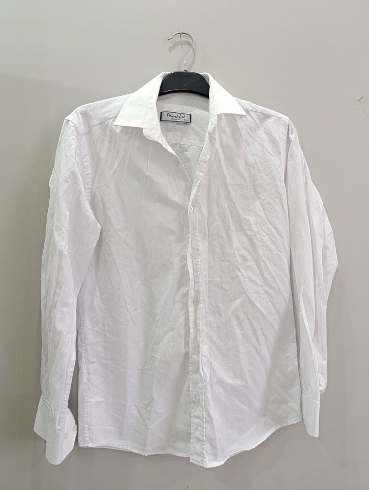 Beyaz, keten kumaştan üretilmiş, düğmeli ve yakalı erkek gömleği. Uzun kollu, normal kesim ve parlak yüzeye sahip, ofis ve günlük kullanım için uygun.
