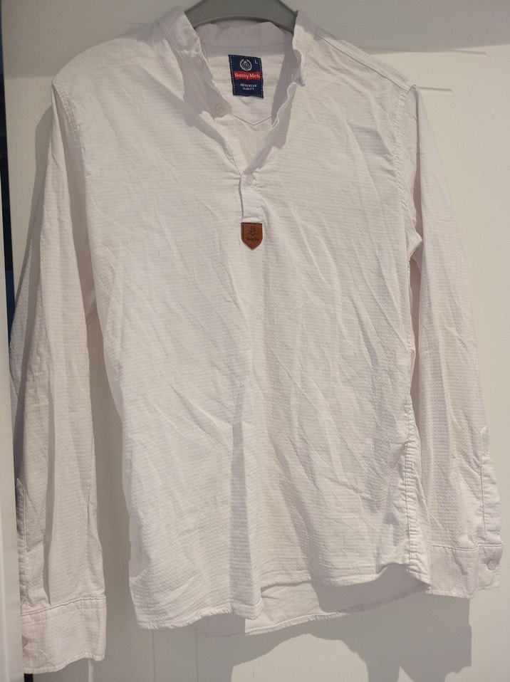 Uzun kollu, yakalı ve düğmeli beyaz keten erkek gömleği. Rahat kesimiyle günlük sokak stiline uygundur. çok iyi sadece utusuz rahat ve esnek çok rahat