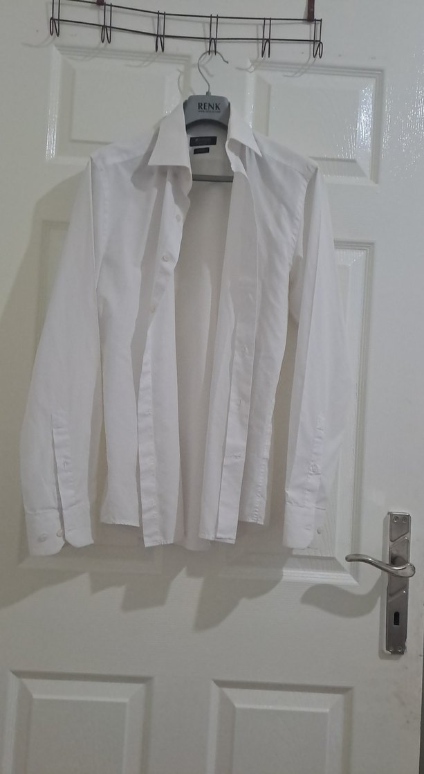 Beyaz erkek keten gömlek, uzun kollu ve düğmeli. Normal kesim, çentikli yaka ve nefes alabilen kumaşla ofis ve günlük kullanıma uygundur.
