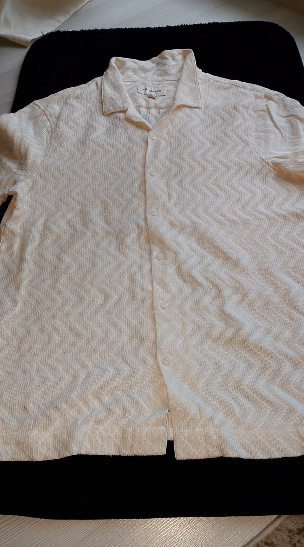 Beyaz keten kumaştan, kısa kollu, düğmeli ve yakalı erkek gömleği. Gevşek kesimiyle rahat ve gündelik sokak stili için uygundur.