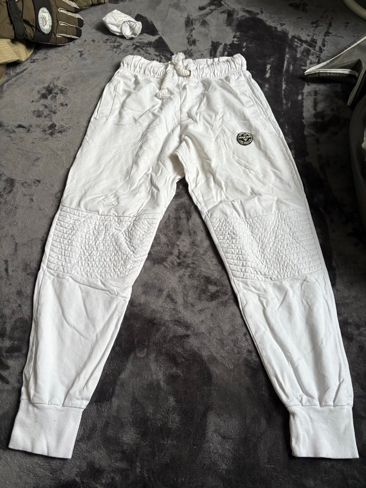 Beyaz keten kumaştan, rahat kesim ve normal boyda erkek eşofman. Fermuarlı cepler ve ayarlanabilir bağcıklı bel içerir, spor ve gündelik kullanım için uygundur. ♂️