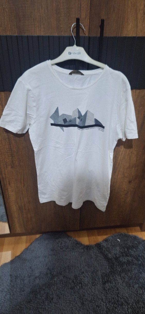 Pamuklu beyaz erkek tişört, kısa kollu ve yuvarlak yakalıdır. Gri baskılı deseniyle sokak stilini yansıtır, rahat ve bol kesimdir. Dış mekan kullanımı için uygundur.