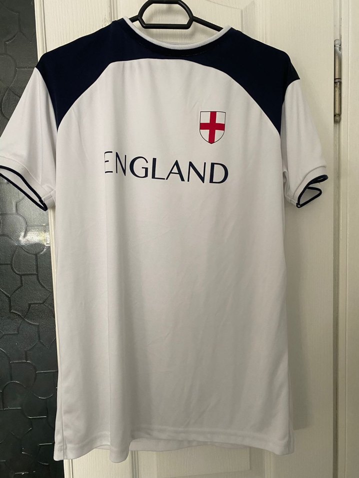 Beyaz ve siyah detaylı, kısa kollu, sentetik kumaş erkek tişörtü. Önünde 'ENGLAND' baskısı bulunur, spor ve günlük kullanıma uygundur. ⚽13-14 yaş erkek çocuk için