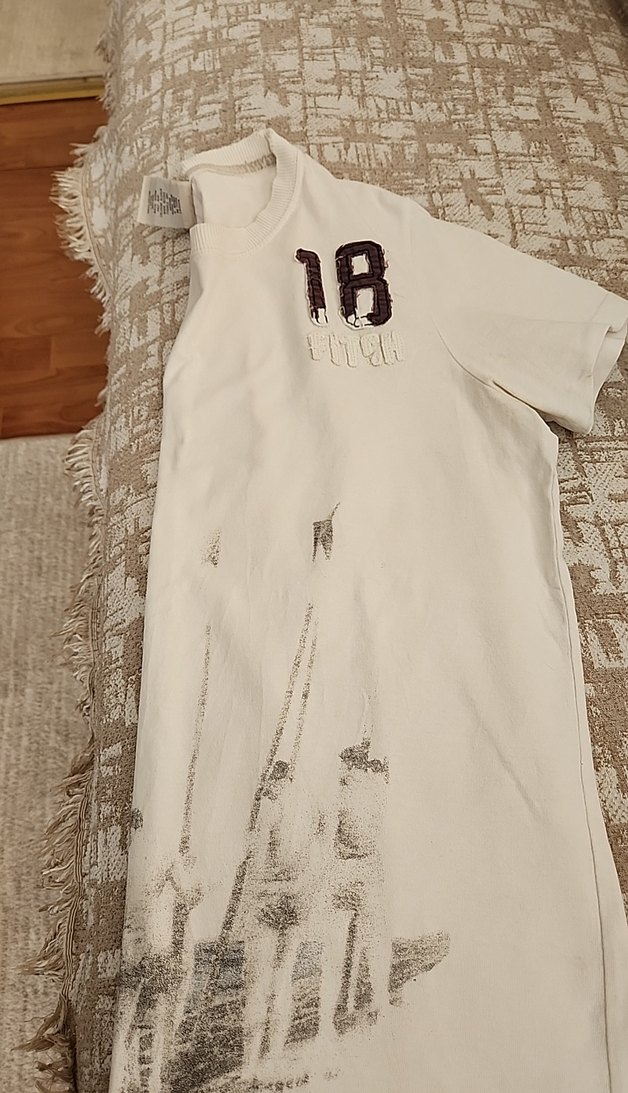 Beyaz renkli erkek kısa kollu polo tişört, yuvarlak yaka ve bol kesimdir. Göğsünde '18' sayısı ve kürk detaylı baskı bulunur. Sokak stili ve athleisure tarzını yansıtır.
