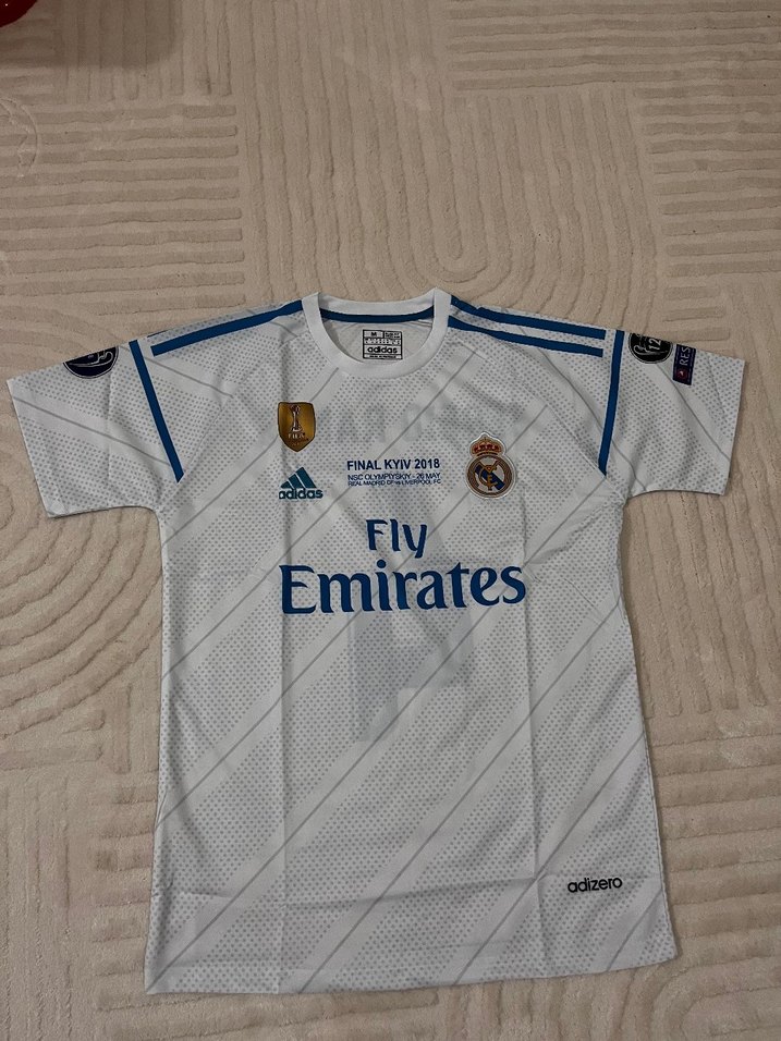Beyaz, kısa kollu, slim fit erkek spor forması. Fly Emirates baskılı, velcro detaylı, hafif sentetik kumaştan üretilmiştir. ⚽