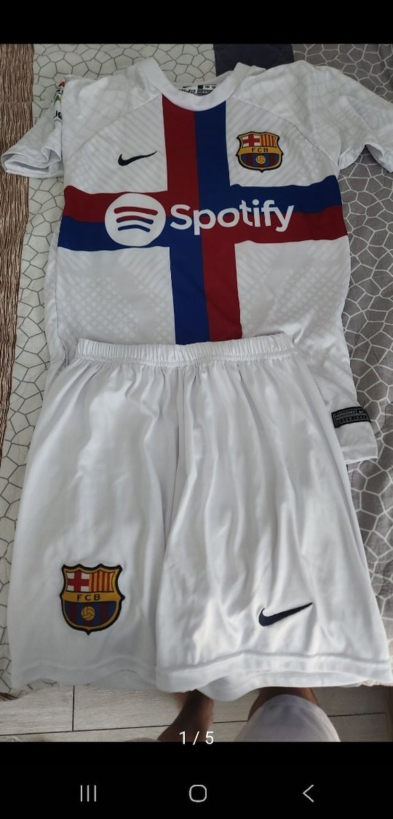 Beyaz renkli, baskılı, düğmeli kısa kollu erkek spor forması ve şort takımı. Sentetik kumaştan, bisiklet yaka ve atletik kesim. Spotify ve FC Barcelona logolu. ⚽