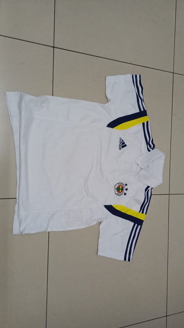 Beyaz renkli, kısa kollu, normal boyda ve fitted kesime sahip erkek spor forması. Sentetik kumaştan üretilmiş, baskılı detaylar ve cırt cırt özelliği bulunur. ⚽