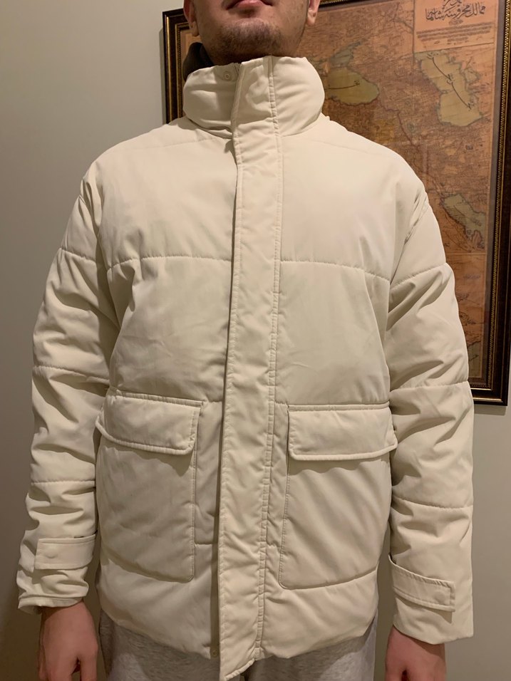 Beyaz renkli erkek kışlık mont, yüksek yakalı ve düğmeli kapamalı. Normal boy, uzun kollu, sade ve minimalist tasarıma sahip, günlük kullanıma uygun.