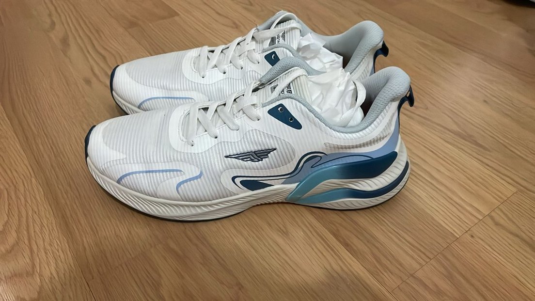 Beyaz, bağcıklı erkek koşu ve antrenman ayakkabısı, kauçuk tabanlı ve gri detaylı sade sokak stili.