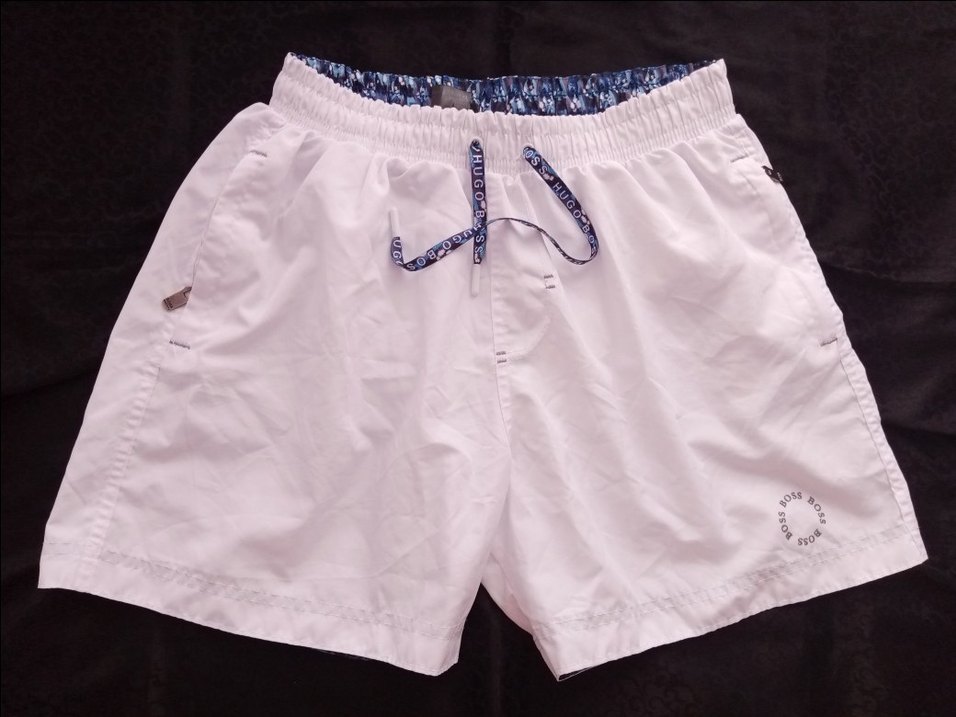 Beyaz, bel detaylı, bol kesim erkek mini şort mayo, plaj ve sokak tarzı için uygun.