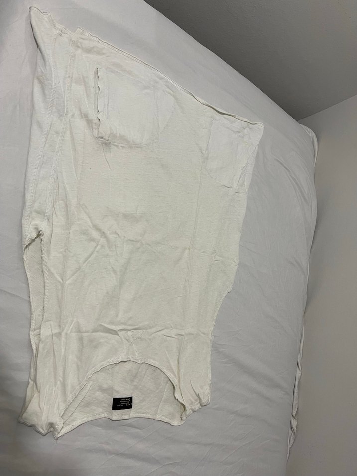 Beyaz renkte, oversize kesime sahip, desen içermeyen erkek atletidir. Midi boyda ve minimalist tarzdadır.
