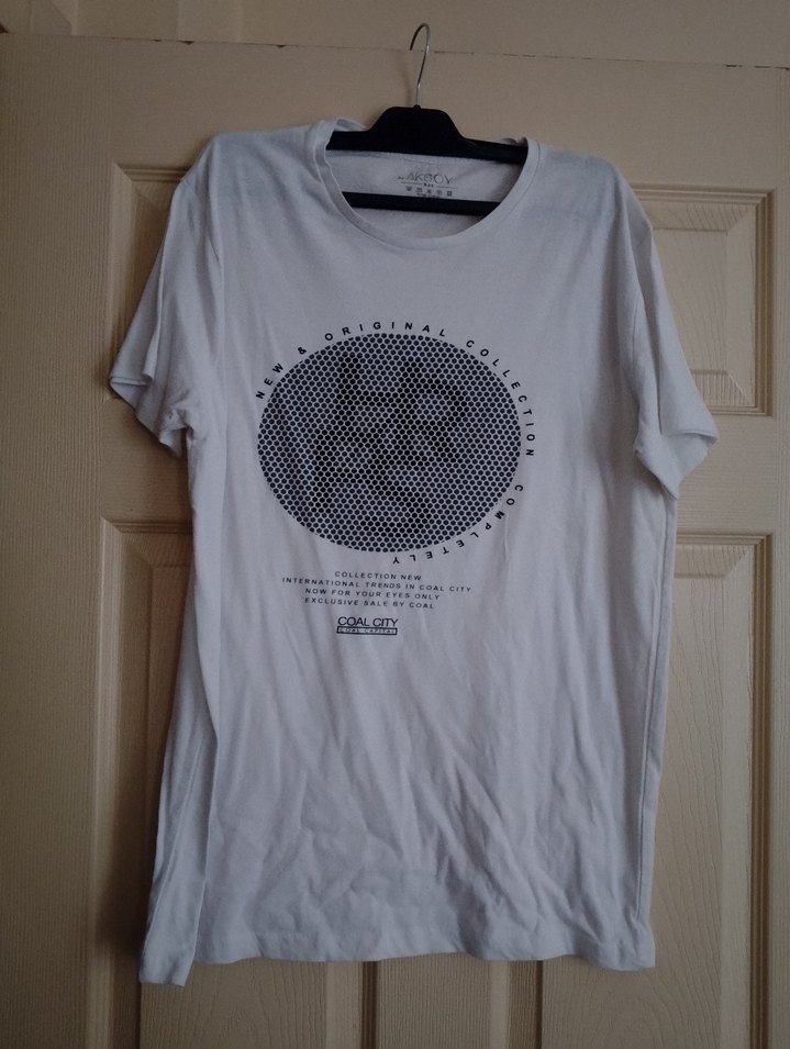 Pamuk kumaştan, baskılı ve oversize kesime sahip beyaz erkek tişört. Kısa kollu, bisiklet yaka, rahat ve günlük kullanıma uygun.