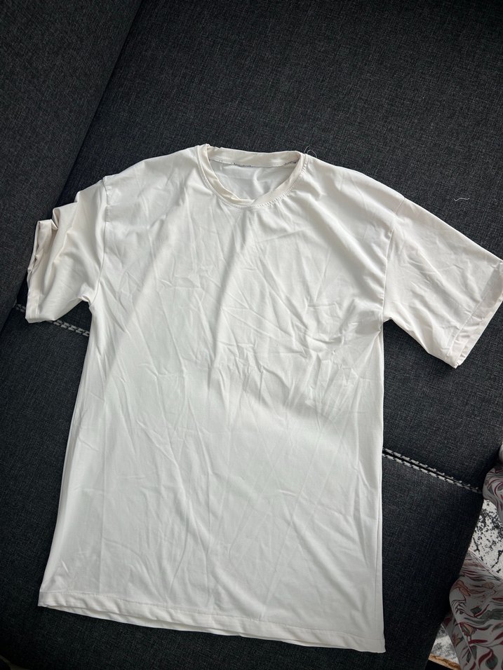 Beyaz renk, oversize kesim ve normal boy uzunluğunda, desen içermeyen minimalist erkek tişörtü.