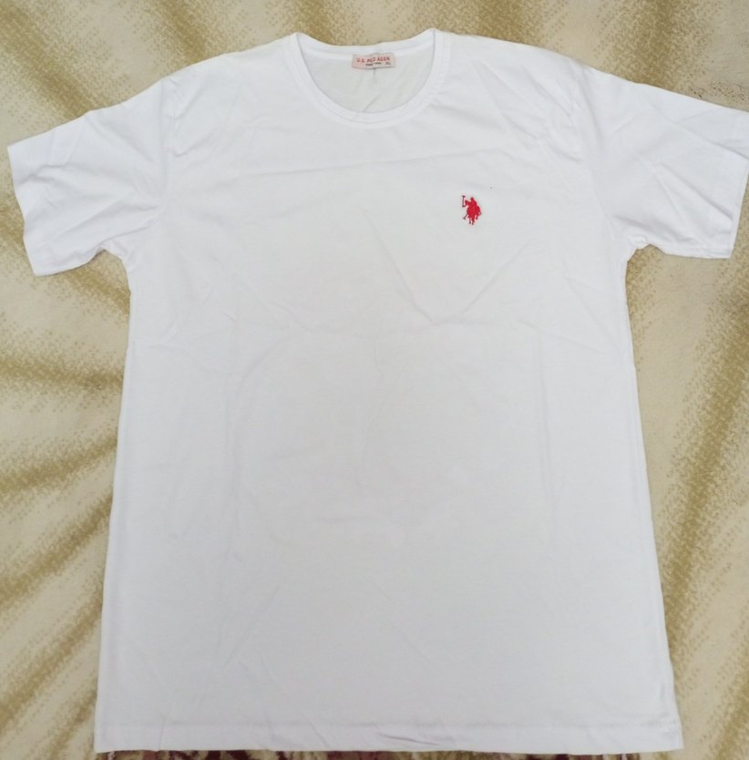 Kısa kollu, yuvarlak yakalı beyaz pamuklu erkek tişörtü, salaş kesim ve küçük kırmızı baskılı logo detaylıdır. Günlük sokak stili için uygundur.