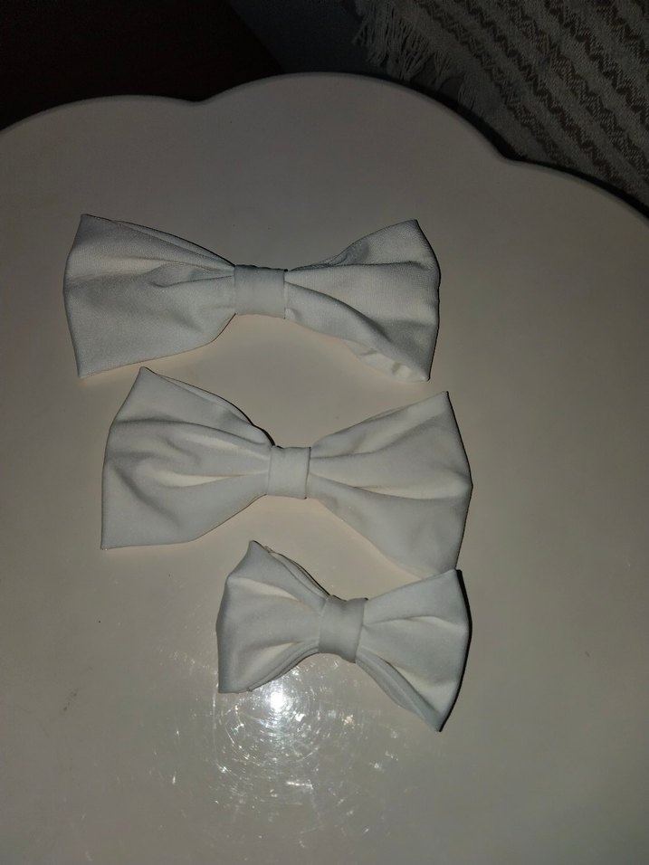 Minimalist ve sade tasarıma sahip üçlü beyaz erkek papyon seti, sokak modasına uygun.