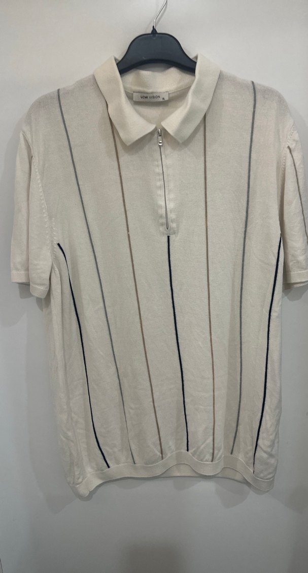 Beyaz renkli, yakalı ve kısa kollu erkek polo tişört. Pamuklu, örme dokulu, bol kesim ve dikey çizgili tasarıma sahiptir. Günlük rahat stil için uygundur.