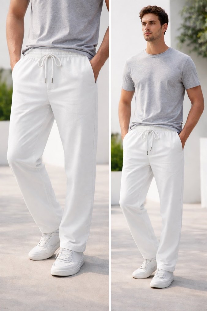 Yumuşak pamuk kumaştan üretilen beyaz erkek pantolon, regular fit ve midi boydadır. Rahat ve şık görünüm sunar.