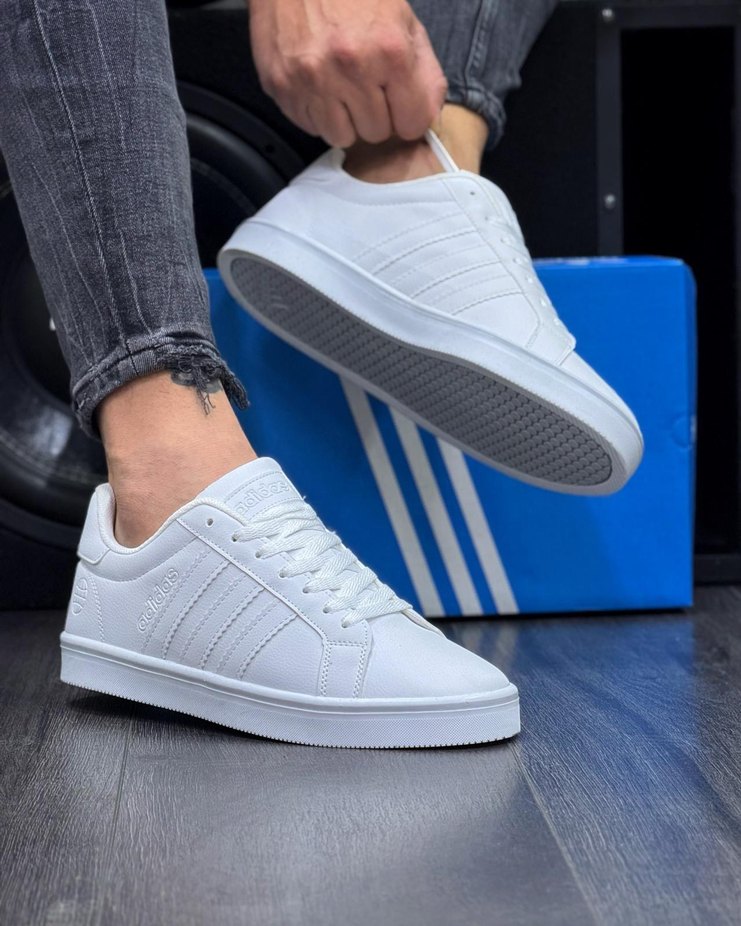 Beyaz renkte, lastik tabanlı erkek spor ayakkabısı. Şık ve rahat tasarımıyla günlük ve spor kullanıma uygun.