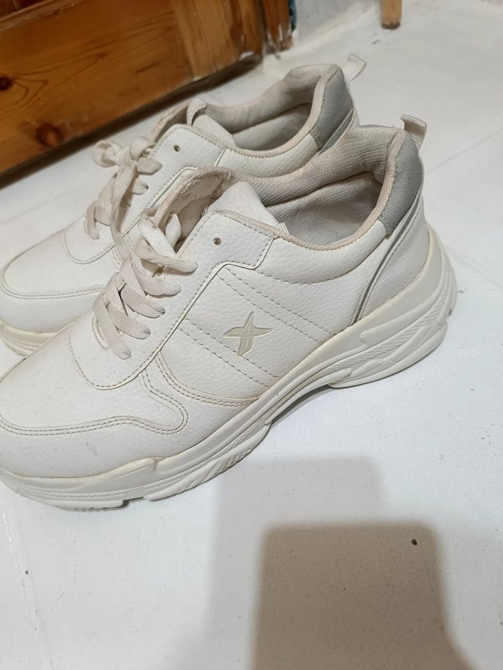 Beyaz erkek spor ayakkabısı, kauçuk tabanlı, desensiz, rahat ve şık bir sokak stili sunar. 42 numara bir defa yürüyüşte giyedi beyaz renge alışık olmadığı için birdaha giymedi. biraz tozlanma var ,cekimde kır gibi gözükmüyor ama aşikar bir kirlenme yoktur.orjinal Kinetix markadır.