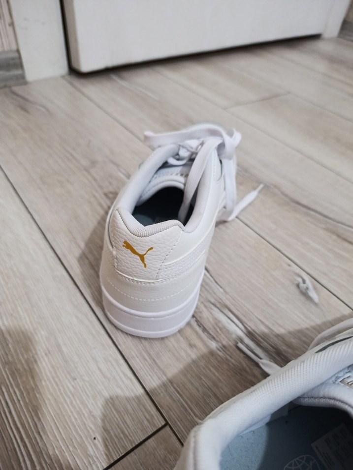 Puma markalı, beyaz, rugan görünümlü, cırt cırtlı, dolgu topuklu erkek spor ayakkabısı.