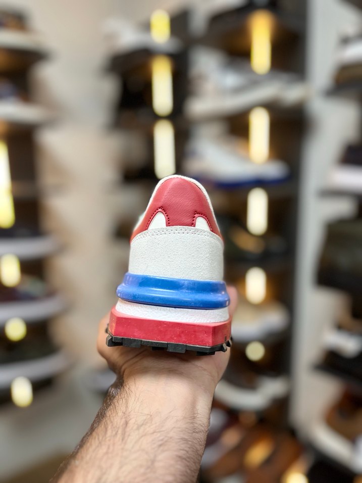 Beyaz tabanlı, kırmızı ve mavi detaylı erkek spor ayakkabısı, velcro bantlı ve kauçuk tabanlıdır.