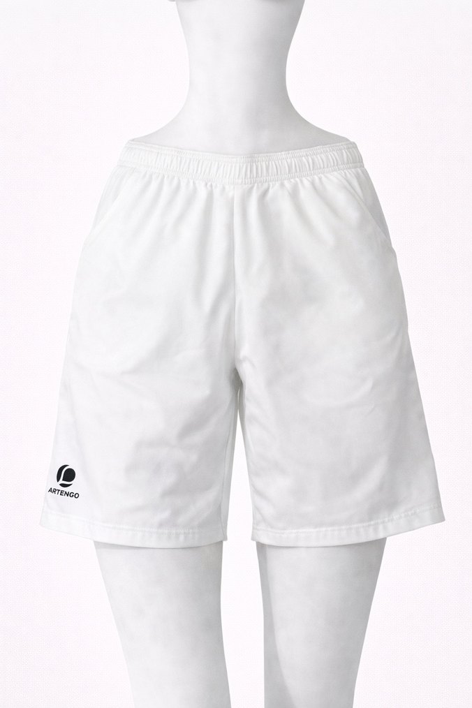 Beyaz erkek şort, bol kesim ve hafif sentetik kumaşla spor ve sokak giyimine uygun. Lastikli bel ve sade desensiz tasarım, küçük logo detayıyla.