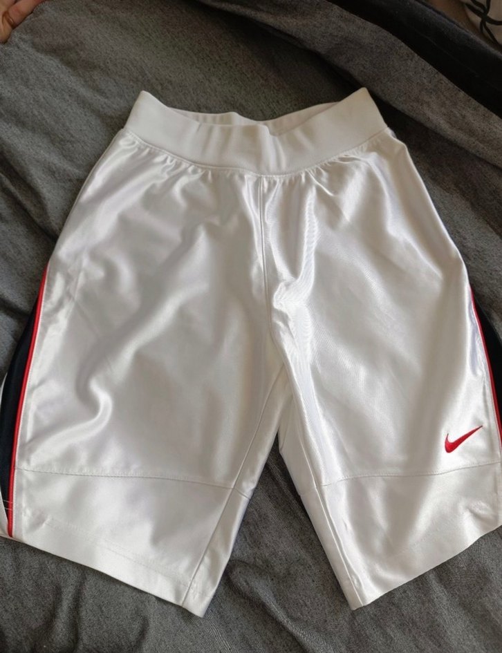 Nike markalı beyaz erkek spor şortu, sentetik kumaştan üretilmiş, midi boy ve dar kesimdir. Spor ve sokak stiline uygun, zahmetsiz şıklık sunar. ⚽ s/m beden uyar 12-13 yaş diyor kullanılamadı