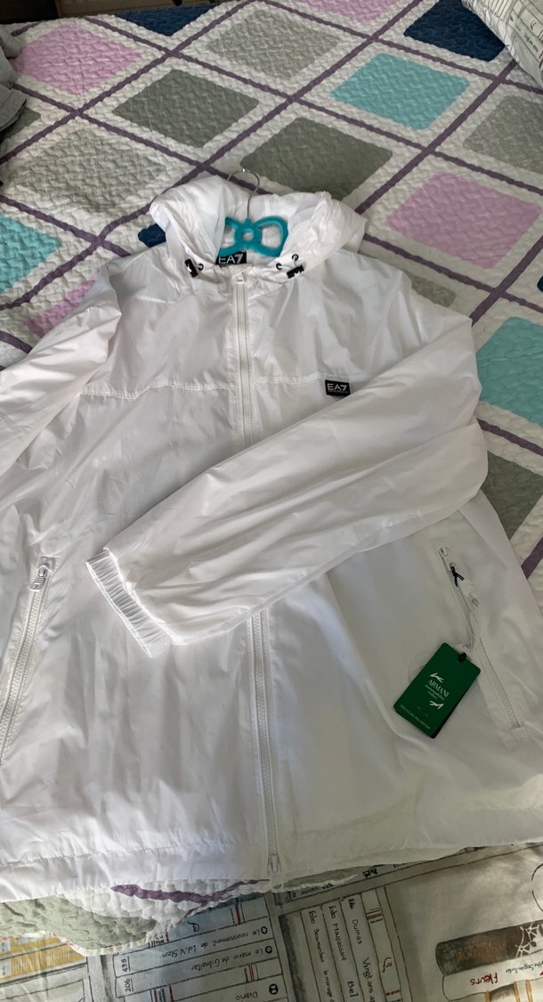 Beyaz, fermuarlı, uzun kollu kadın spor ceket. Sentetik kumaştan, rahat kesim ve çıtçıtlı yakalı, dış mekan kullanımı için uygun. Milano’dan Armani yağmurluk rüzgarlık koşu antrenman rahat yürüyüşler için