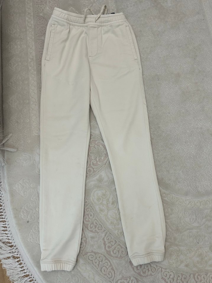 Beyaz, midi boy, normal kesim kadın eşofman altı. Rahat sentetik kumaştan, dış mekanlarda şık ve rahat kullanım için uygundur.