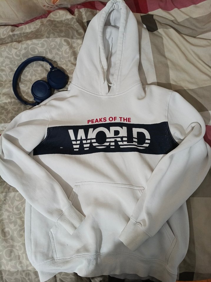 Bu beyaz fermuarlı erkek sweatshirtü, bisiklet yaka ve uzun kolludur. Yumuşak ve sıcak tutuyor. ufak kusurları var baskı kısmında fotoğrafta belirtilmiştir