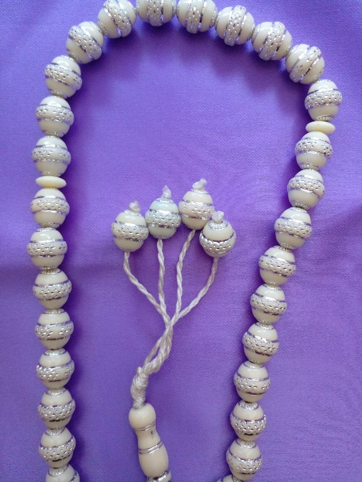 Pastel tonlarda, geleneksel tasarıma sahip beyaz erkek tesbih boncukları, zarif süslemeler içerir.️