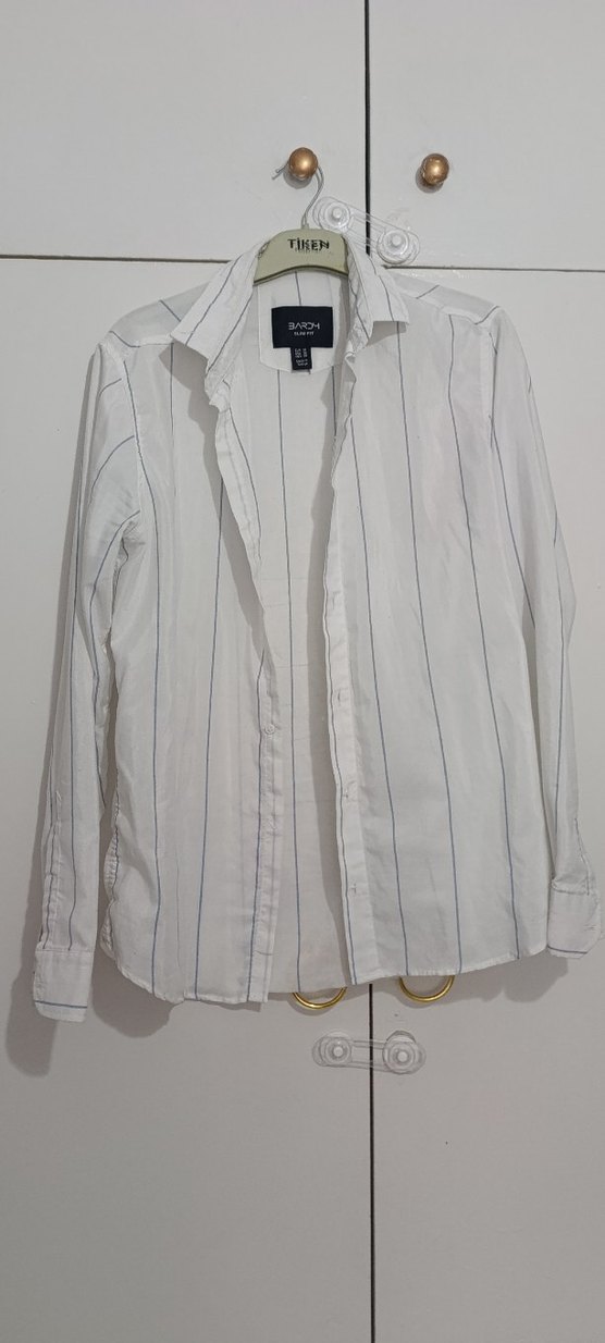 gömleğin bazı düğmeleri yoktur Bu erkek gömleği, kruvaze yakalı ve düğmeli ön detaylara sahiptir. Pamuktan üretilmiş, uzun kollu ve regular fit modeldir. Beyaz renk, ince gri çizgilerle ofis ve günlük kullanıma uygundur.