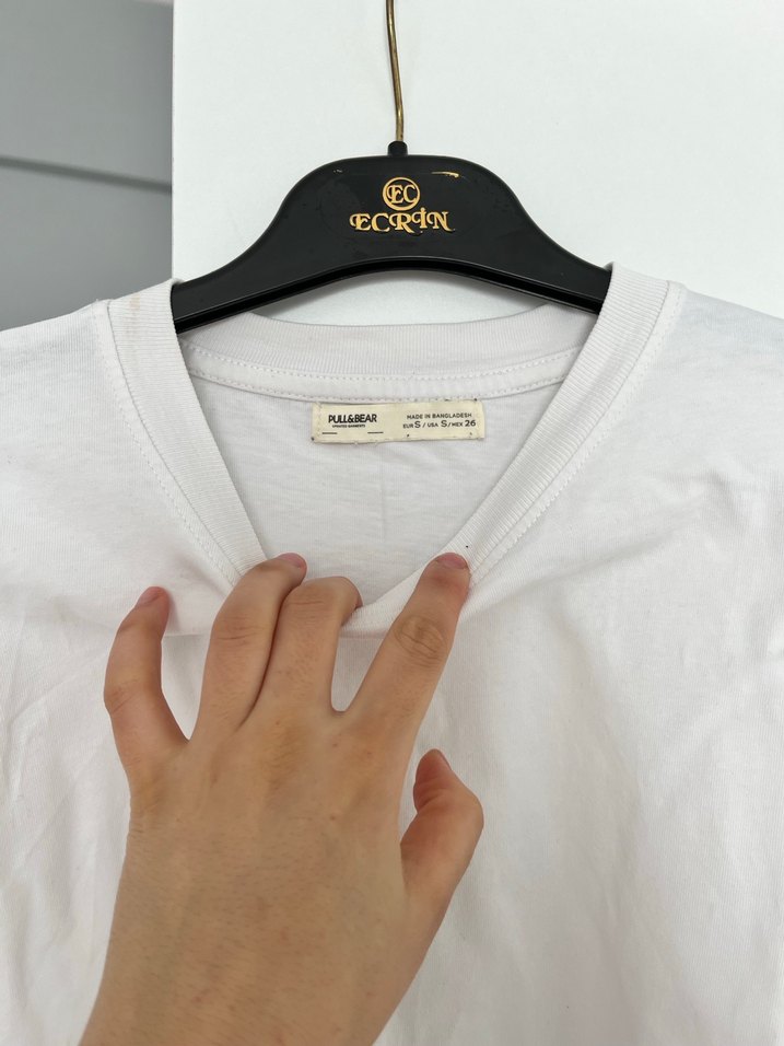Beyaz renkte, V yaka ve bol kesim erkek tişört. Gri tonlarda baskısı bulunan, normal boyda ve rahat bir kumaşa sahip. Üzerinde "ECRIN" etiketi yer alıyor.