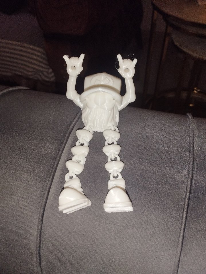 Beyaz aksiyon figürünün esnek eklemleri ve elleri havada eğlenceli bir pozu vardır. Bölümlü bacakları hareket kabiliyeti sağlar.