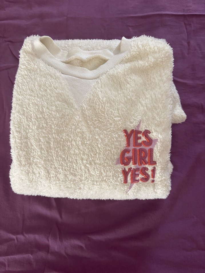 Beyaz, uzun kollu, yuvarlak yakalı eşofman takımı. yumuşak peluş detaylı ve "YES GIRL YES!" baskılıdır.