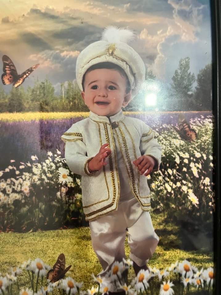 Beyaz renkli, etnik desenli, uzun kollu ve kabarık detaylı, yaka kısmı notched lapel olan, bohem ve sade tarzda çocuk kostümü. Şehzade sünnet kıyafeti 3 ay yazıyor ama benm oğlum 11 aylıktı foto çekimi için kullandık sadece temiz kutusunda duruyor ev ayakkabıları 3-6 ay ile uyumlu