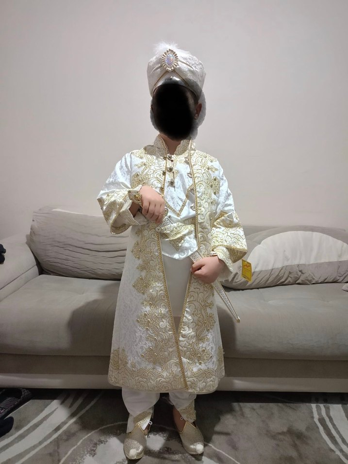 Uzun kollu, etnik desenli, beyaz ve drapeli çocuk kaftanı, modest ve klasik kesimle tasarlanmıştır 8/10 yaş uyumlu kılıcı ve ayakkabısı da vardır.