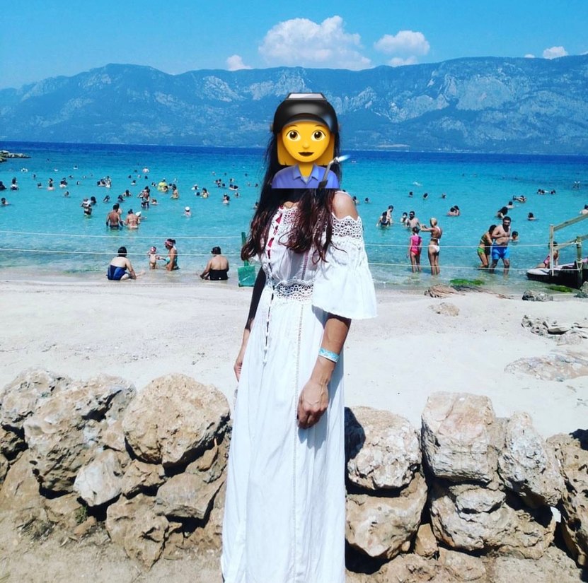 Beyaz renkte, etnik desenli, askılı ve salaş kesim uzun elbise, plajda kullanım için uygundur.