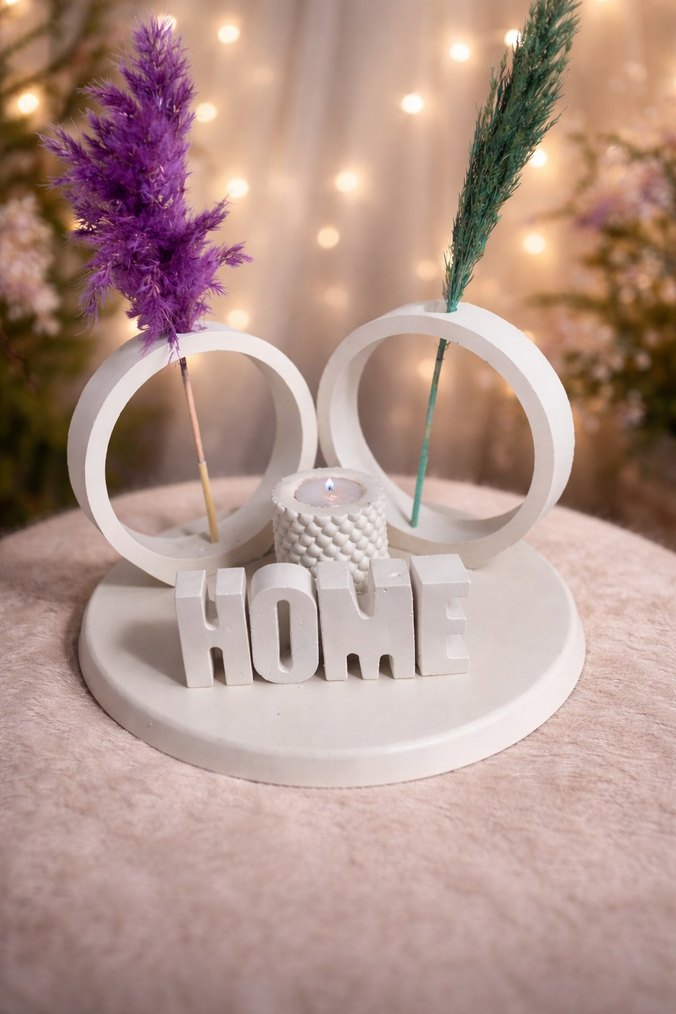 Beyaz renkte, pastel renkli kurutulmuş çiçekler ve dokulu mumluk içeren, 'HOME' yazılı yuvarlak tabanlı ev dekoru seti. ️
