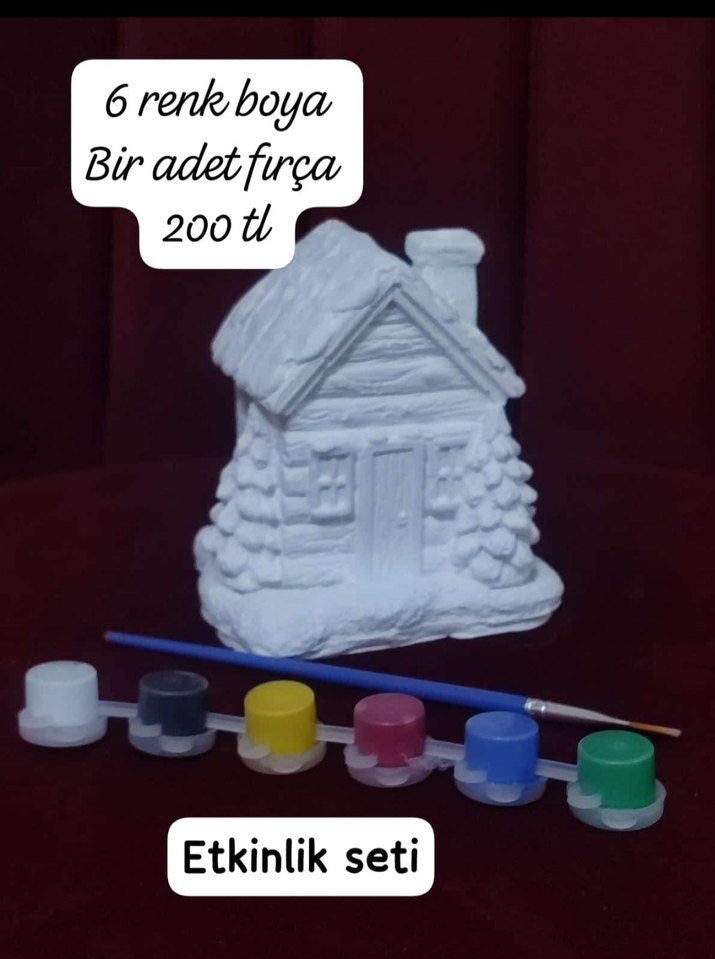 Beyaz ev model seti, bir adet fırça ve 6 renk boya içerir. Etkinlik seti olarak 200 TL'dir.