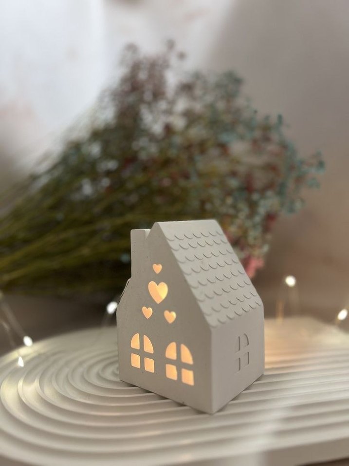 Bu beyaz mumluk, küçük bir ev şeklindedir ve kalp ile pencere kesimleri ışığın süzülmesini sağlar, sıcak bir ortam yaratır. ️