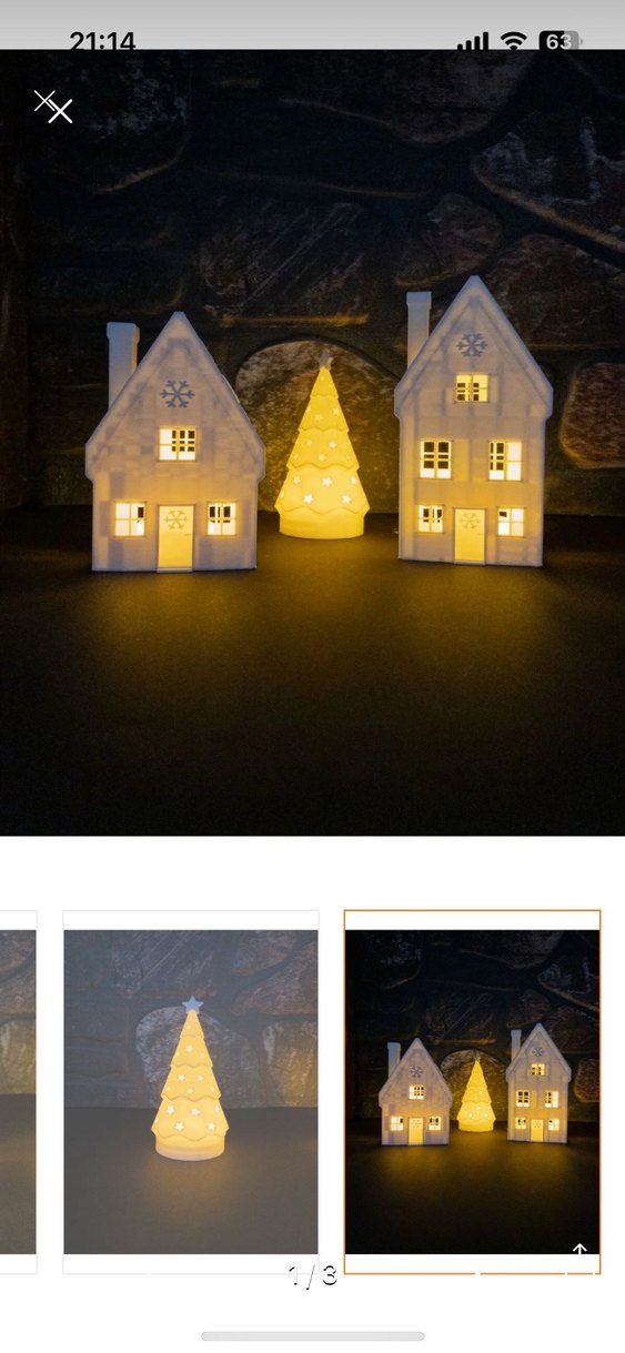 İki ev ve bir çam ağacı şeklinde beyaz mumluk seti, yandığında sıcak bir ışık yayar. ️ Mumlar kırıldı ama evler iyi durumda.
