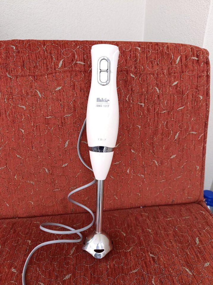 Beyaz renkte, iki kontrol düğmeli ve paslanmaz çelik karıştırma koluna sahip Fakir el blenderıdır.