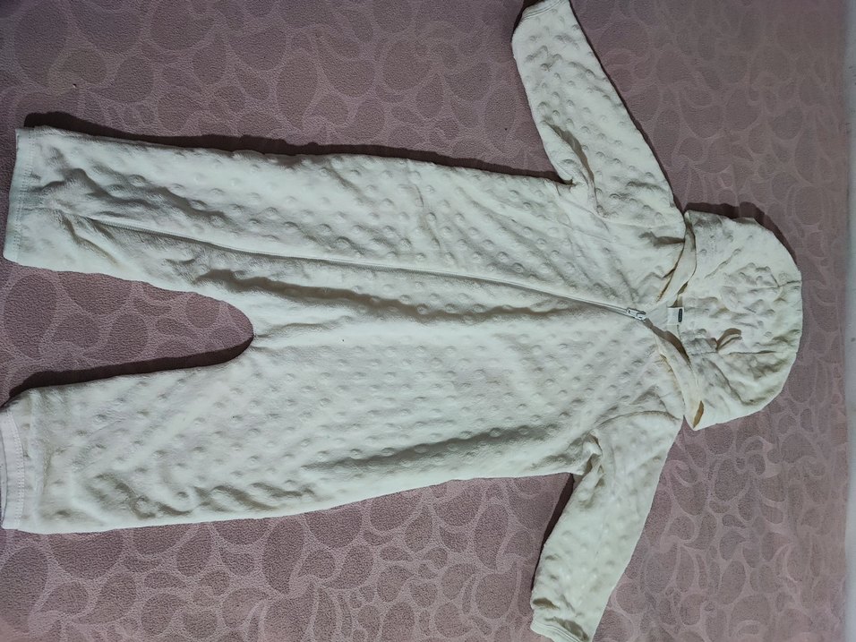 Beyaz renkte, fermuarlı, yuvarlak yakalı, yumuşak dokulu bebek kız tulumu. Pastel tonlardadır. ❄️