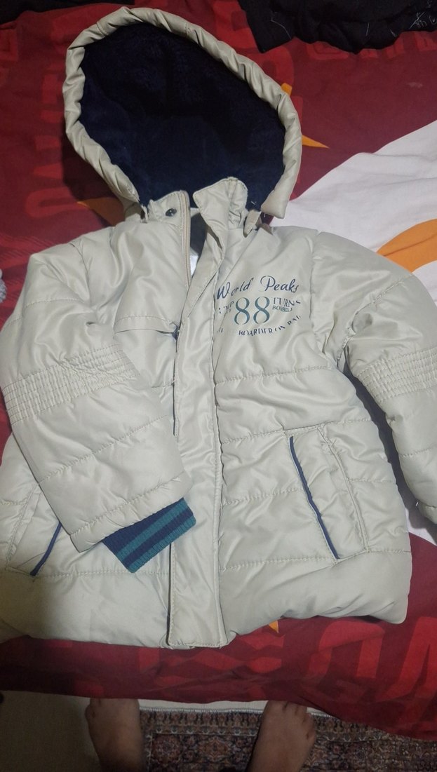 Fermuarlı ve kesimli, notched lapel yakalı beyaz erkek çocuk montu. Yumuşak ve sıcak dokulu kumaştan yapılmış