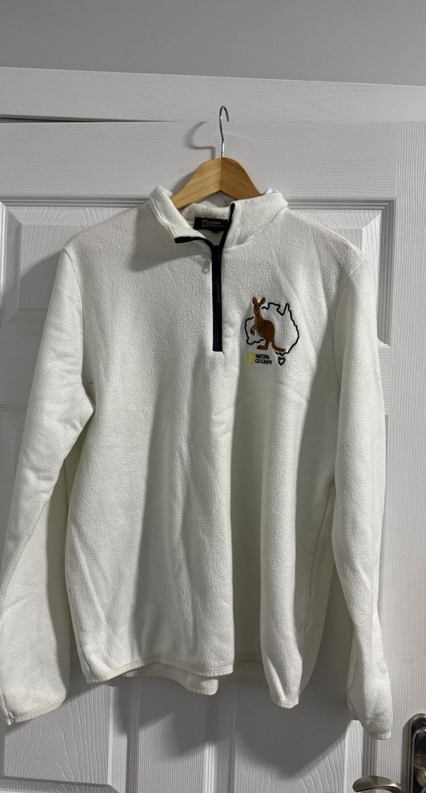 Beyaz renk, fermuarlı ve yakalı unisex polar sweatshirt. Rahat kalıp ve baskılı desene sahip, günlük kullanıma uygun.