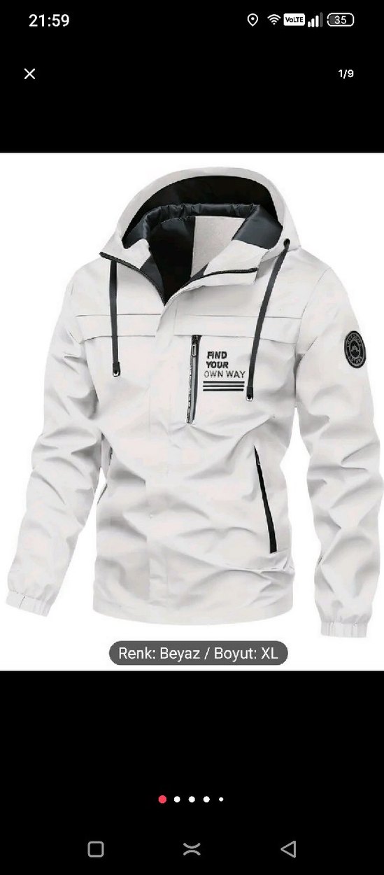 Beyaz renkli, fermuarlı ve yüksek yakalı erkek ceket. Uzun kollu, baskılı ve rahat kesim, dış mekan kullanımı için uygundur.
