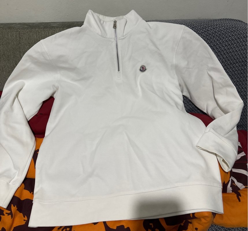 Beyaz renkli, fermuarlı yüksek bisiklet yaka ve uzun kollu, vücuda oturan erkek sweatshirtü. Yumuşak ve sıcak kumaştan üretilmiştir, günlük sokak stili için uygundur.
