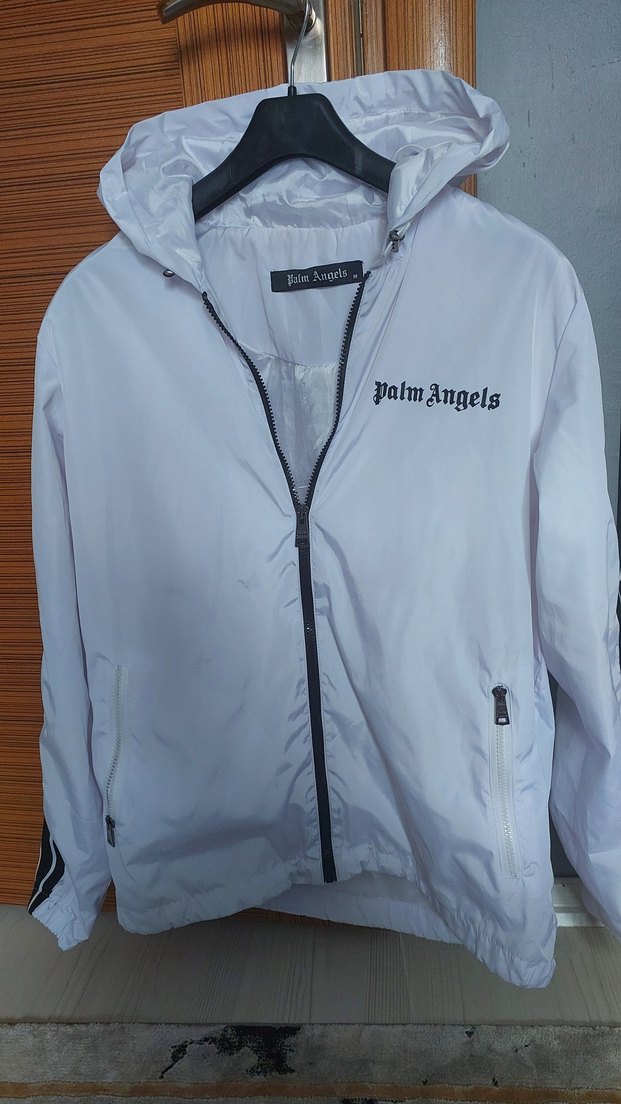 Fermuarlı, notched lapel yakalı, parlak sentetik kumaştan yapılmış beyaz, dar kesim erkek yağmurluğu. Uzun kollu ve Palm Angels baskılı, dış mekan kullanımı için uygun. ️