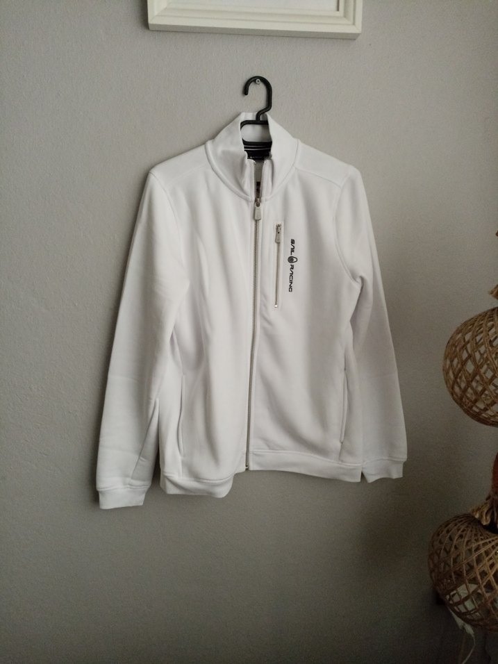 Yumuşak kumaştan yapılmış, fermuarlı ön ve göğüs cebi bulunan beyaz, uzun kollu, sıfır kullanılmamış içi polarlı orjinal unisex XS ve S uyumlu